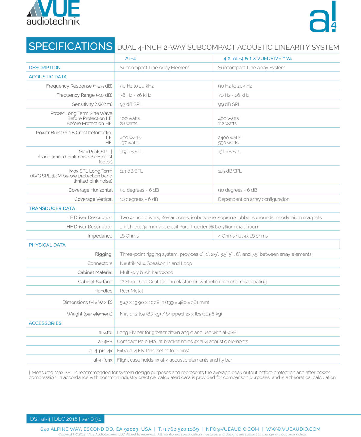 Il Line Array System al-4 è costituito da Al-4 Acoustic Element, il V4 systems engine, montato su rack, che fornisce amplificazione, DSP e controllo di sistema e il subwoofer isobarico che può essere posizionato su flybar, al-4SB, insieme ad una vasta gamma di accessori per sospensione e trasporto. Il sistema è venduto in blocchi standard, con otto elementi acustici al-4 e un singolo V4 Systems Engine (progettato per alimentare fino a 8 elementi al-4). Più blocchi al-4 possono essere combinati per affrontare applicazioni più grandi.