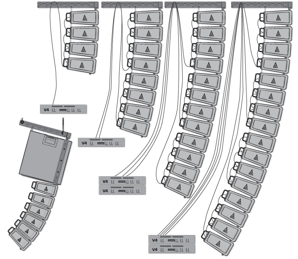 • Ogni “blocco” del sistema di array di linee subcompatte al-4 include otto elementi acustici al-4 e un singolo V4 Systems Engine