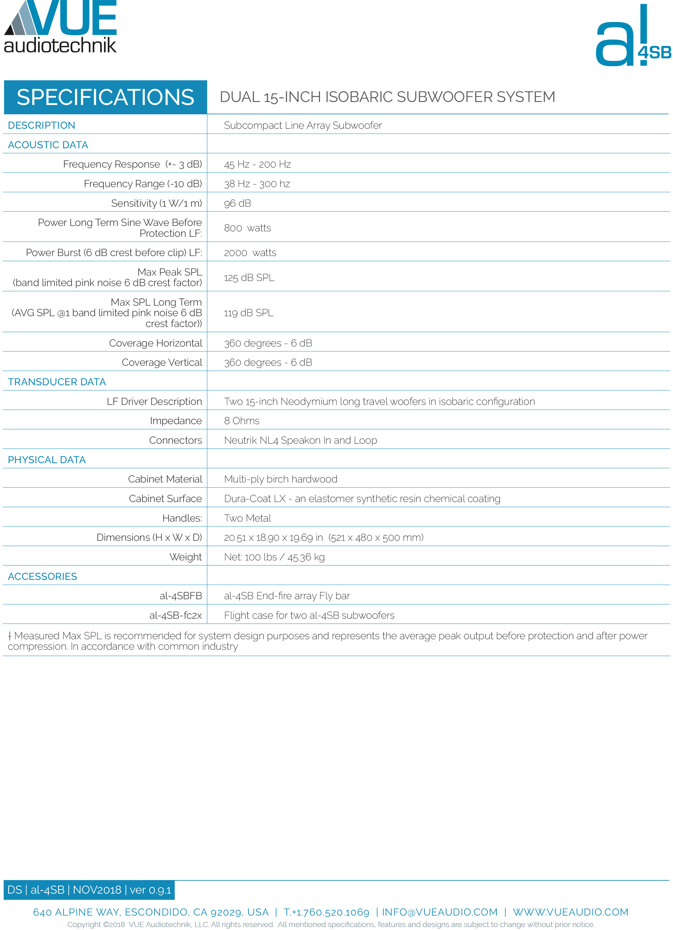 Il subwoofer al-4SB è progettato con due potenti trasdutttori da 15″ specificamente per l’uso con il sistema line array ultra compatto al-4. Beneficiando dello stesso avanzato carico isobarico presente nel nostro formidabile subwoofer as-418, al-4SB estrae un’eccezionale uscita a bassa frequenza da un pacchetto molto compatto. Se combinato con un sistema di array line al-4, al-4SB offre una riproduzione a bassa frequenza potente e ben definita fino a 45 Hz.