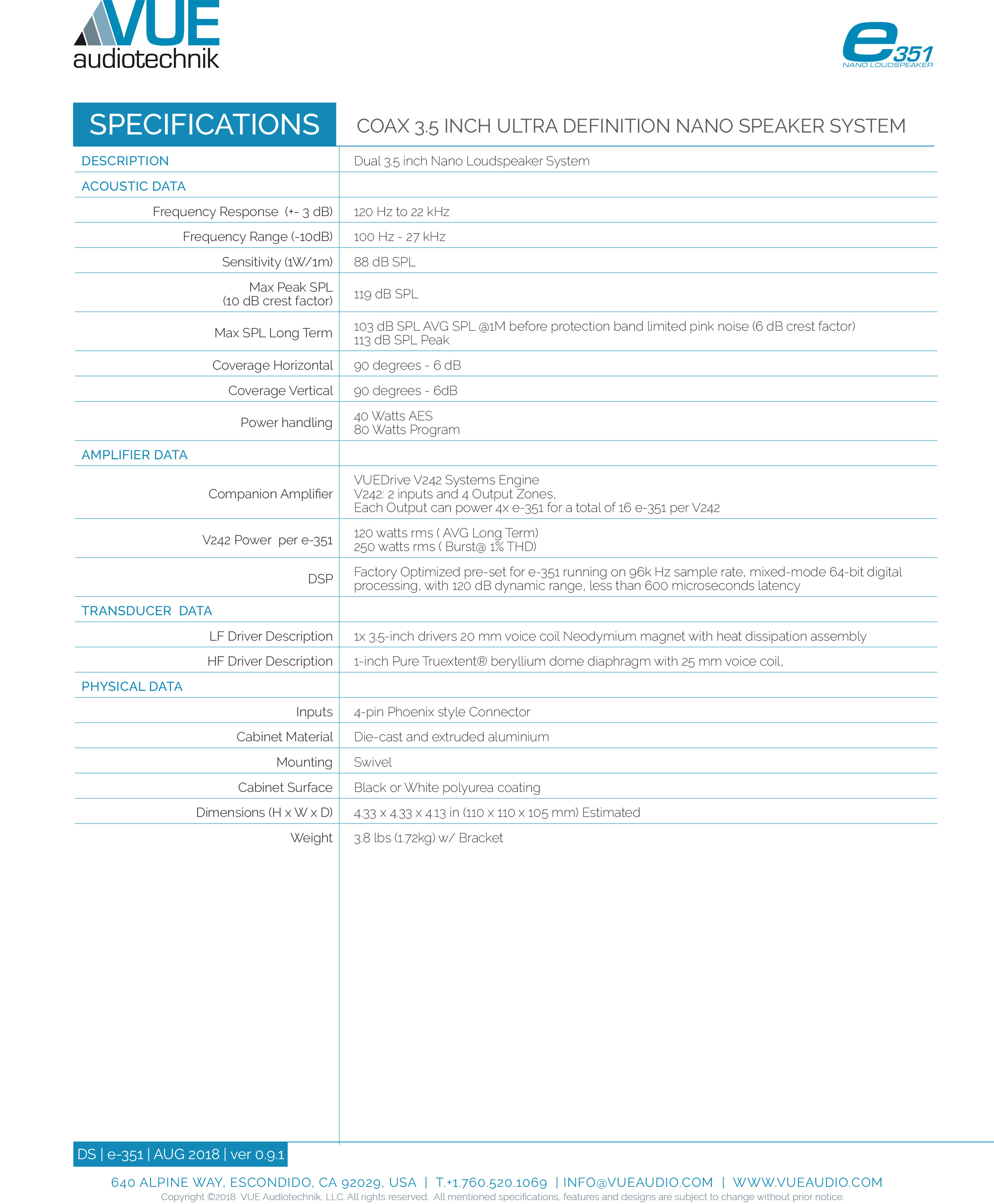 Il diffusore a due vie e-351 Nano Speaker, progettato per una qualità di suono per audiofili, ridefinisce le piccole capacità degli altoparlanti producendo un suono ed una qualità eccezionalmente alta con una risposta qualitativa di 130Hz, un sistema compatto in alluminio pressofuso e resistente alla corrosione.