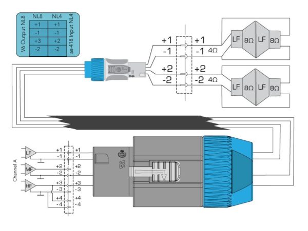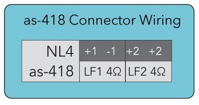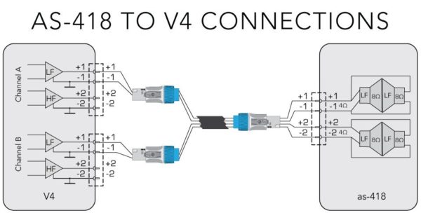- Dual drive 4-ohm loads, pin 1 +/-, pin 2 +/-